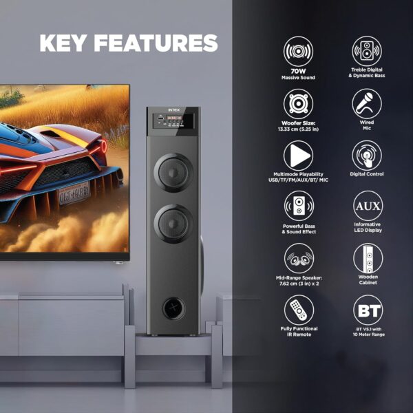 Intex 700-S Multimedia 70 W Bluetooth Tower Speaker | Wired Karaoke Mic | Party Speaker & 5.25 Inch Woofer | LED Display & Bluetooth v5.2 | Fully Remote Control (Black)