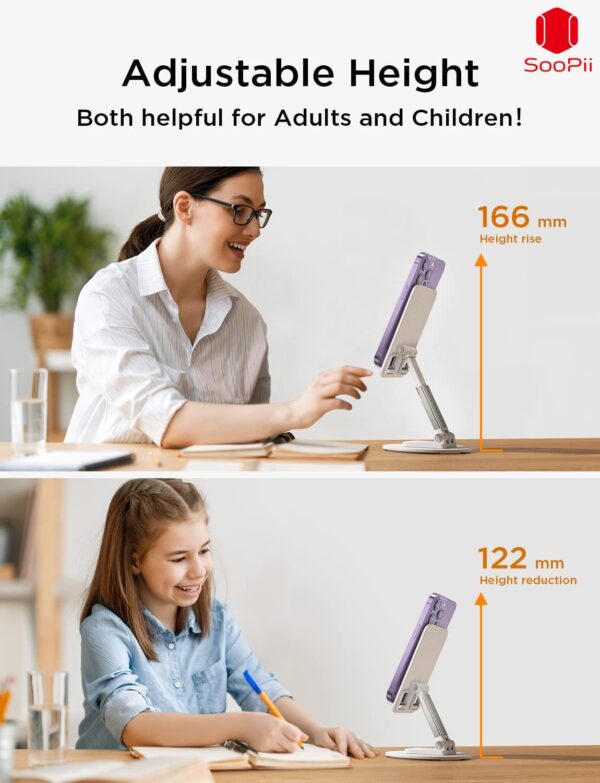【Height and Angle Adjustment】: With hassle-free rising-lowering design and adjustable tilt angle design, SooPii tablet stand holder for desk is extendable in height and allows you to customize the angle of device for you to find the most comfortable viewing angle.