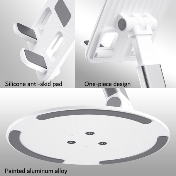 【Stable and Sturdy Tablet Stand】: Made of solid aluminum alloy with double supporting poles and larger base,the ipad stand is really durable and stable without tilts over. The protective hooks hold your device tightly without falling.Anti-slip silicone pads protect your device and desk from scratching and sliping. Its max load capacity of this stand is 2.2 lbs/1 kg.